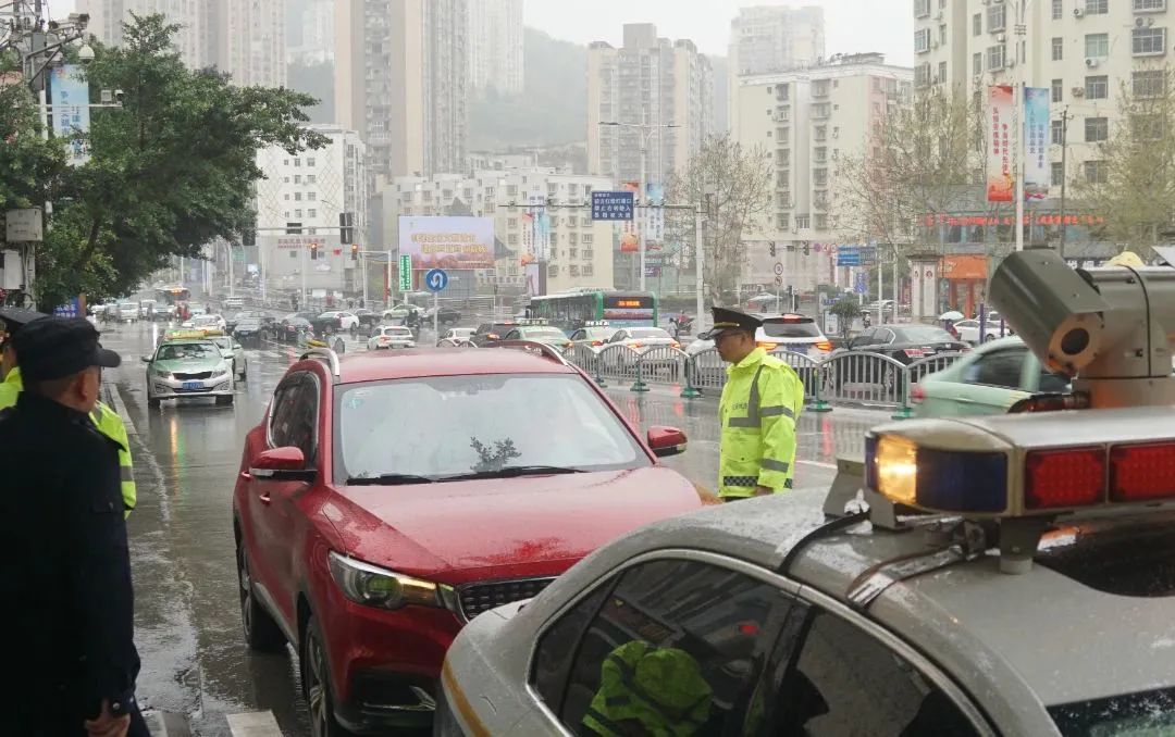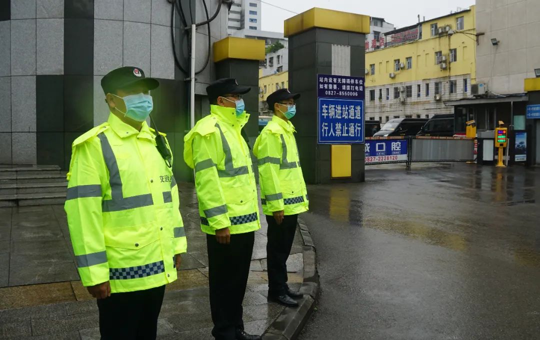 ▲巴中火车站出口的交通执法人员正在维护站外秩序