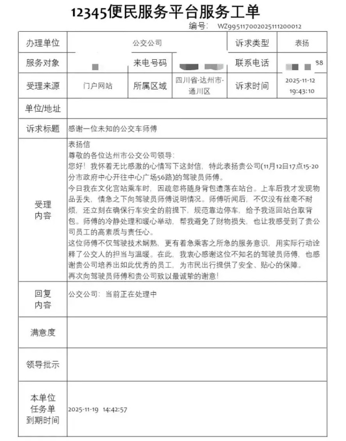 近日,达州市公交公司收到一份来自12345政务服务热线的特殊工单。诉求人只为给56路驾驶员的暖心帮助点赞!经核查,这位传递温情的驾驶员正是省级民族团结进步示范线56路的唐滟。