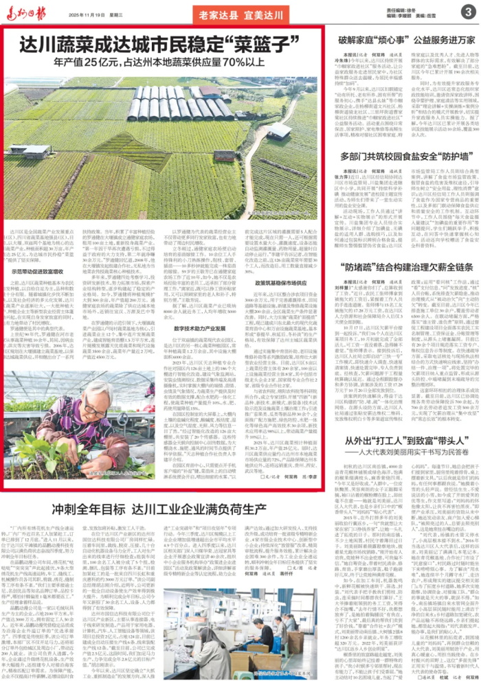 达川区是全国蔬菜产业发展重点县(区)、四川省蔬菜基地强县(区),目前,以大堰、双庙两个基地为核心的达川蔬菜产业,种植面积超30万亩,年产值达25亿元,为达城市民拎稳“菜篮子”提供了坚实保障。